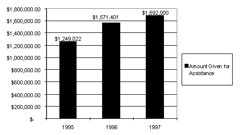 Emergency rent and utility assistance distributed in 1995 by the EAP was $1,249,022. In 1996, assistance increased 25.8% to $1,571,401. In 1997, it increased again to $1,692,000, up 7.7%. Increased requests for emergency assistance may be attributed to rising costs of rent and utilities, increasing poverty rates, lack of affordable housing, rising property values and changes in federal and state welfare laws. The increase in EAP assistance is a positive trend toward meeting demand, and it is exceeding inflation rates. Additionally, community resources, such as Caritas, CEACO and local churches, provide limited funding for rent and utiltities not included in Figure 4.5.2.