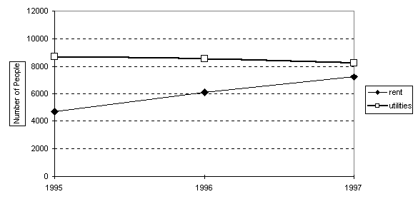 Between 1995 and 1997, the number of individuals receiving rent assistance rose, while the number of individuals receiving utility assistance declined slightly. Typically, rent and utility assistance is provided once a year per client.