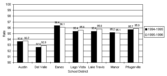 All school districts show higher than 92% attendance rates. There has not been much change between the 1994-95 school year and the 1995-96 school year.