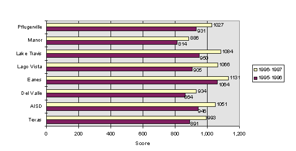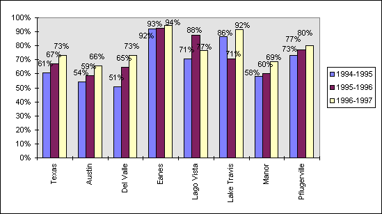 TAAS scores (reading, writing and math for grades 3 through 8 and 10) measure academic performance. Figure 4.2.1 highlights the percentage of Travis County students passing the TAAS. In all school districts, an increasing percentage of students passed the assessment from SY94-95 to SY96-97. As shown in Table 4.2.2, over a five-year period, Del Valle (31.8%) and Manor (24.5%) had the highest increases in the percentage of students passing the TAAS; however, these districts, along with Austin I.S.D., still fall below the state average passing rate of 73.1 percent. Lago Vista was the only district with a smaller percentage of students passing in SY96-97 than in SY92-93.