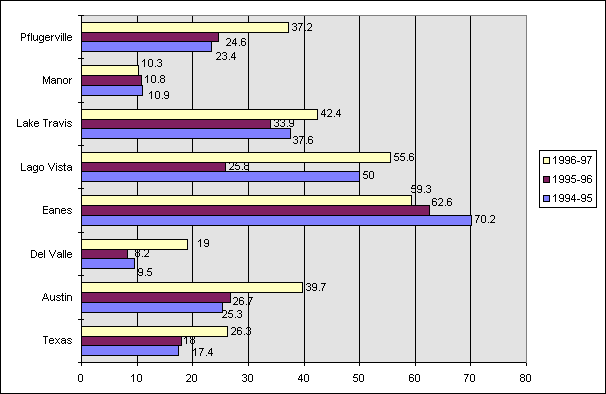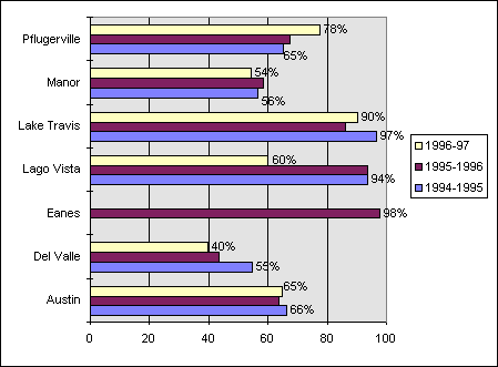 To understand the issues described below, it is necessary to examine some characteristics of the seven school districts in Travis County. Austin I.S.D. is the largest, with over 70% of all county students. Lago Vista I.S.D. is the smallest, with 731 students in SY96-97, less than one percent of all Travis County students. Table 4.2.1 shows the students enrolled by school district in SY96-97, including the percentage of students who are economically disadvantaged (qualify for free or reduced-price meals) and the percentage of students who are minorities. The Austin, Manor, and Del Valle school districts have the highest percentages of economically disadvantaged students and also of minority students.