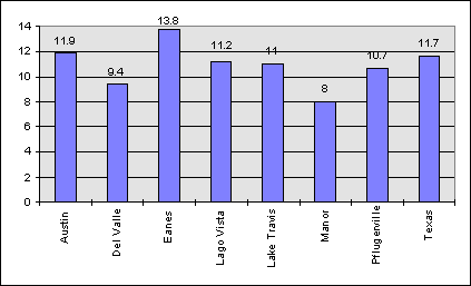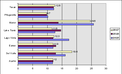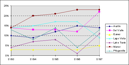 Most of the districts in Travis County have turnover rates under the state average. The exceptions are Manor I.S.D., with a turnover rate almost twice the state average in SY96-97, and Del Valle I.S.D.