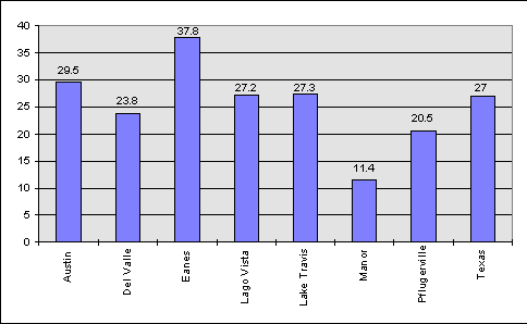 Figure 4.2.7 shows the percentage of teachers in each district with masters or doctoral degrees. Eanes I.S.D. far surpasses the state average, with about 38% of the teachers having advanced degrees. Manor I.S.D. has the lowest percentage of teachers with advanced degrees, at less than half the state average of 27 percent. Del Valle and Pflugerville I.S.D.s also fall below the state average.