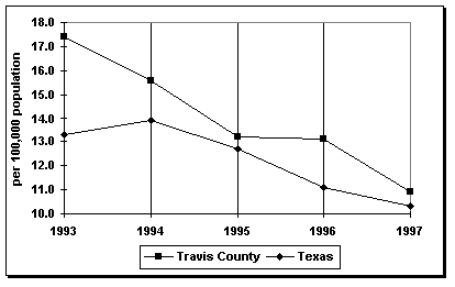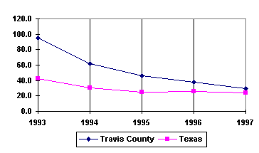 The Travis County infant mortality rate was 5.9 per 1,000 live births in 1996 compared with 6.3 per 1,000 live births for Texas; however, Travis County's infant mortality rate only decreased from a rate of 6.2 in 1992, while Texas's rate fell from 7.7.1 If the infant mortality rate is used as an indicator of maternal and infant health and the overall quality of life, it can be said that Travis County residents enjoy a higher quality of life and better maternal and infant health than the state as a whole. That advantage, however, is fast eroding as Travis County fails to keep pace with the state's improving infant mortality rate.