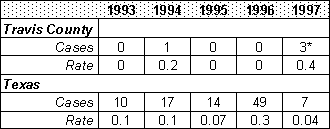 From 1990 to 1996, there were a total of 27 deaths (0.6 per 100,000 population) from tuberculosis in Travis County (13 White, 6 African American, and 8 Hispanic).