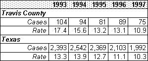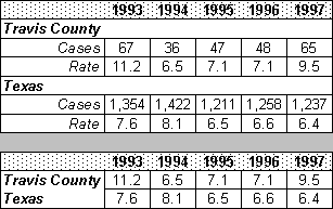 For the period 1980 to 1996, chronic disease indicators for Travis County revealed the following: