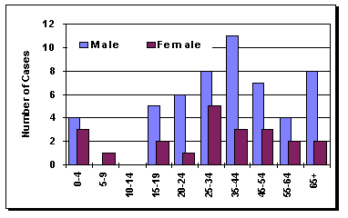 In Travis County in 1996, the number of deaths due to poisoning dropped for the first time since 1993 (3.8 per 100,000). However, those between the ages of 25 and 34 had the highest number of deaths (9 out of a total of 26 deaths) and the highest death rate (6.7 per 100,000). Following closely were those between the ages of 35 and 44 (7 deaths or 6.4 per 100,000). The mortality rate for accidental poisoning rose steadily from 1980 to 1995 (0.8 or in 1980 to 6.2 or 46 deaths in 1995 and 3.5 or 26 deaths in 1996).