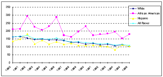 There has been a significant overall decline in the mortality rate for cardiovascular disease in Travis County. However, the mortality rate (1996) for African American males remains substantially higher than the Year 2000 target, at 357.4 deaths per 100,000 population compared to 195.4 per 100,000 Hispanic male population and 166.8 per 100,000 White male population. The mortality rate (1996) for females ranges from 172.1 deaths per 100,000 African American population to 112.0 per 100,000 White population and 101.7 per 100,000 Hispanic population.