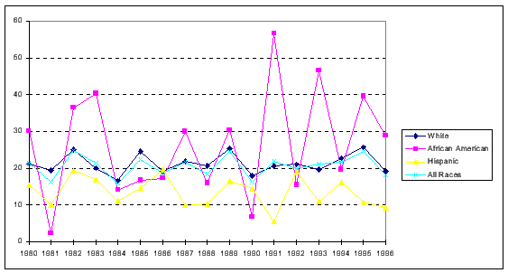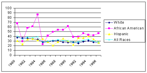 The mortality rate decrease of 39.8% for African American males (139 per 100,000 in 1980 and 83.7 per 100,000 in 1996) was followed by the 33.3% decrease for White males (62.1 per 100,000 in 1980 and 41.4 per 100,000 in 1996).