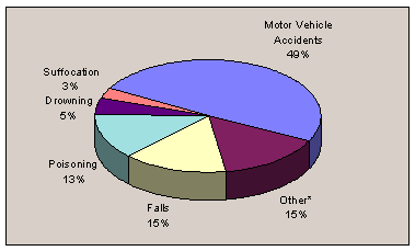 The figure below illustrates that motor vehicles were by far the leading cause of deaths in 1996 (14.1 per 100,000 or 49 % of the total). Falls were the second leading cause (4.3 per 100,000 or 15% of the total) followed by poisoning (3.8 per 100,000 or 13% of the total).
