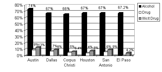 Alcohol is the most commonly used substance across all grade levels in Austin ISD and beer the most commonly abused alcoholic beverage. Tobacco is the second most used substance in all grades; other drugs are third. In 1997, 56% of 12 graders surveyed had used alcohol in the last 30 days, 32% had used tobacco, and 29% had used illicit drugs during that time period.